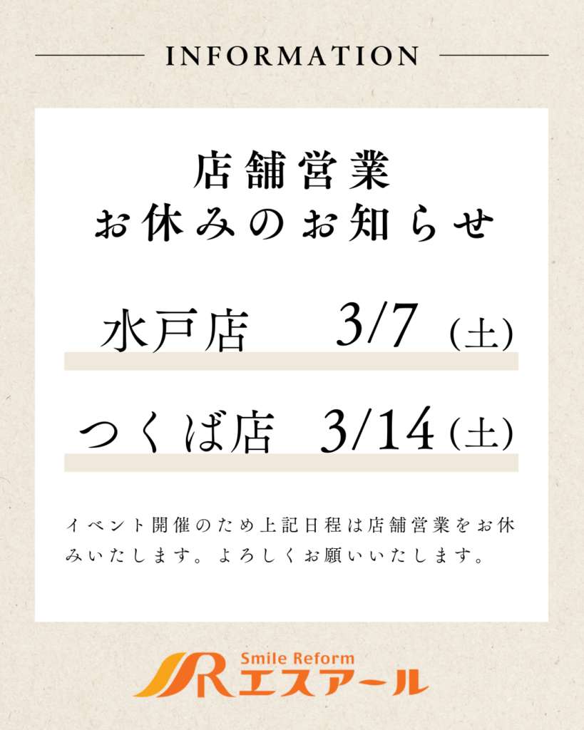 2026.03.04 【水戸店・つくば店】臨時休業のお知らせ TOTOショールームにてイベント開催のため下記日程を臨時休業といたします。 ■水戸店・・・3/7 (土) ■つくば店・・3/14 (土) ご迷惑お掛けしますが、よろしくお願いいたします。