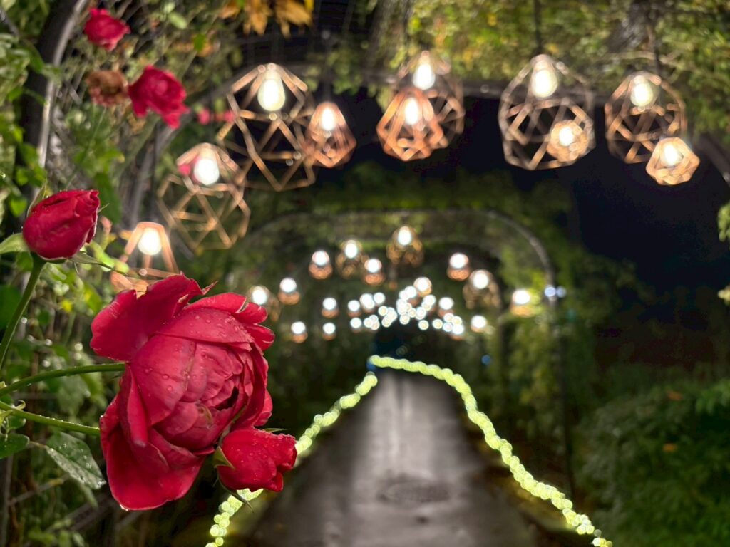 花や木に沿うようにライトが仕掛けてあるからまぶしすぎなくて優しい光 写真もすごく撮りやすかった。